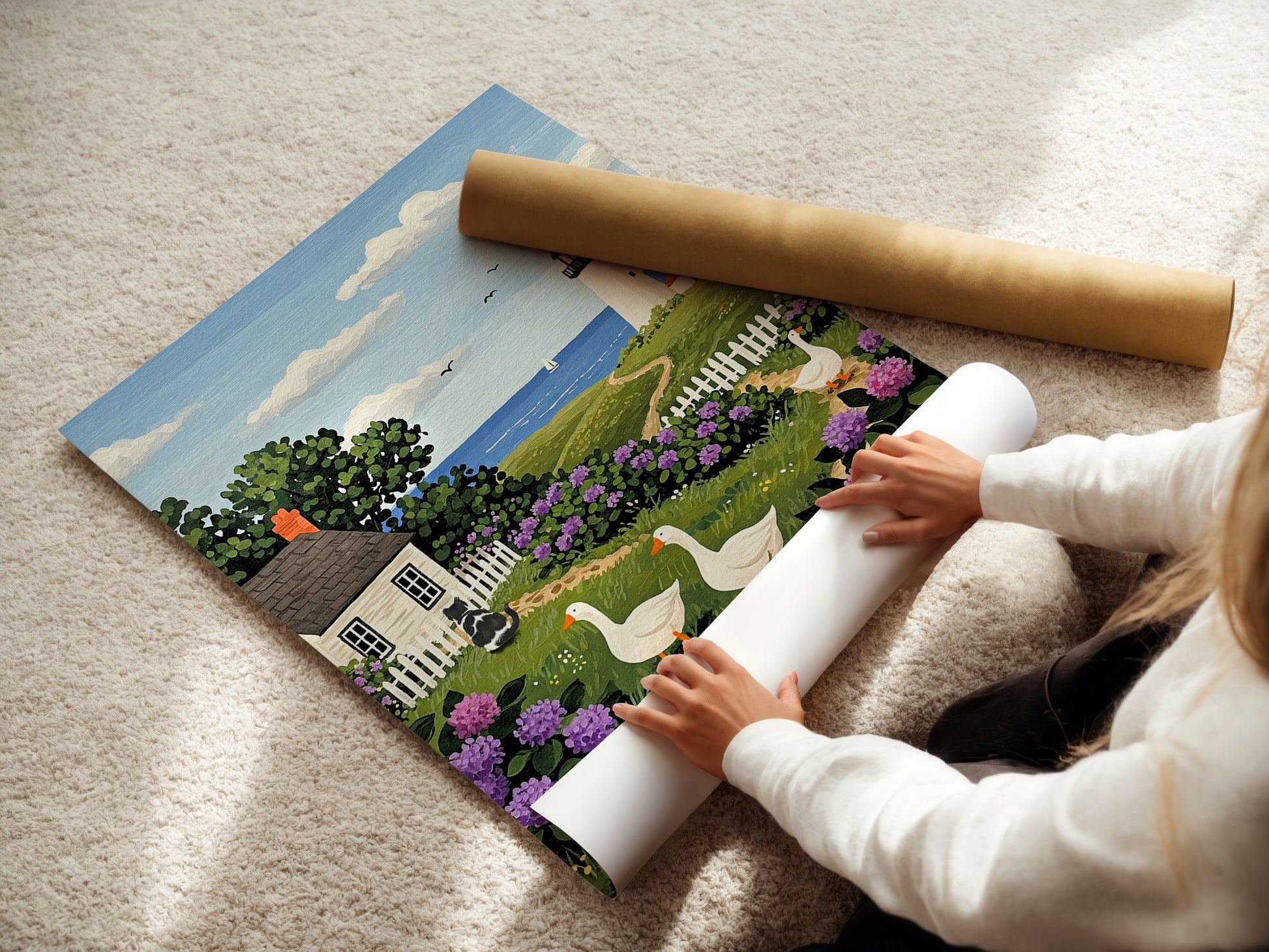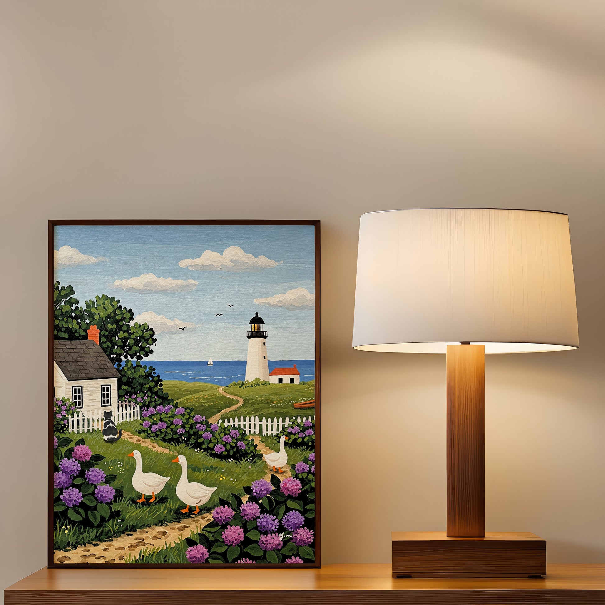 Countryside Ocean Landscape Painting Countryside Ocean Lighthouse Handdrawn Coastal Wildflower Field Cat Art Ducks Beach Illustration Animal Cat
