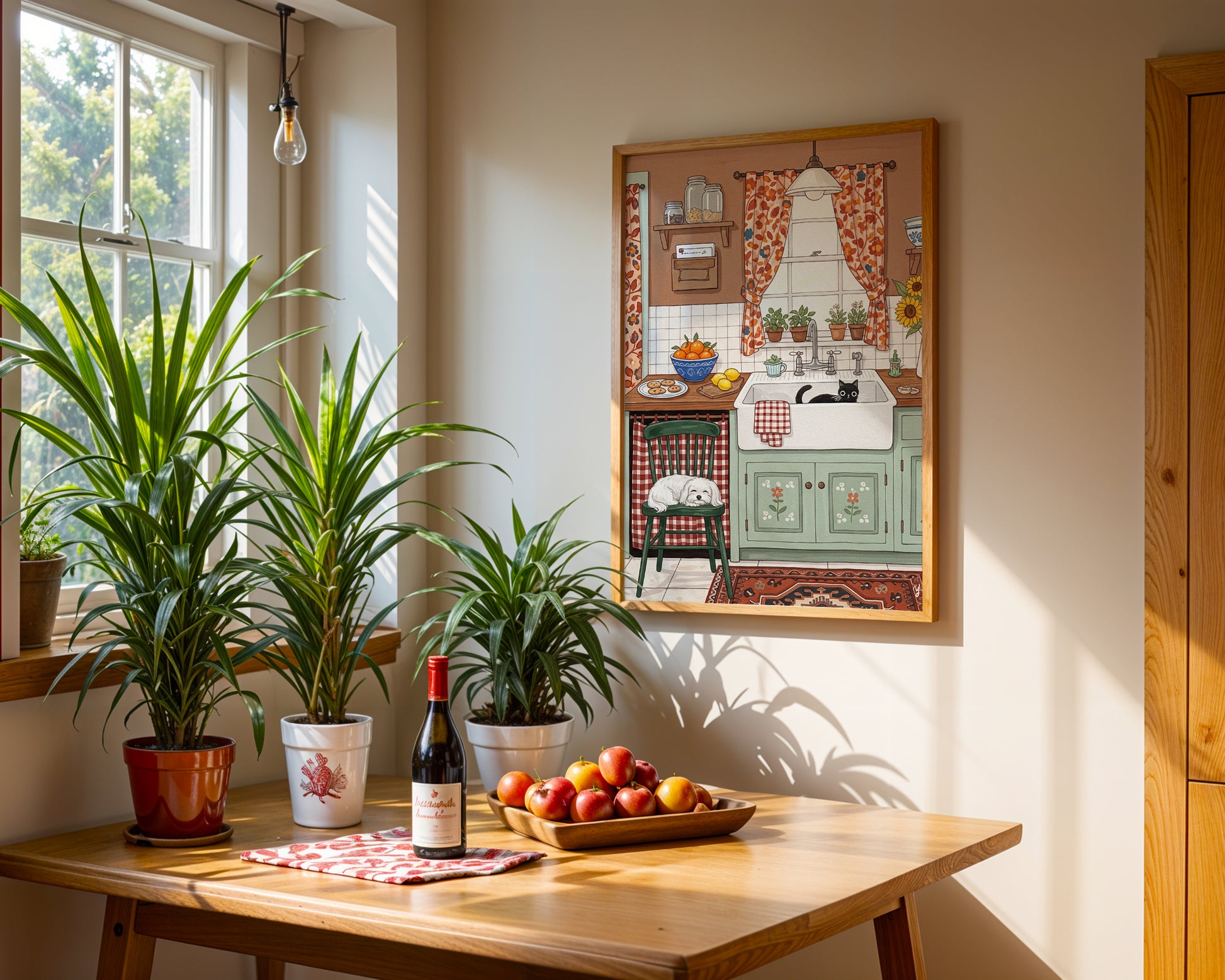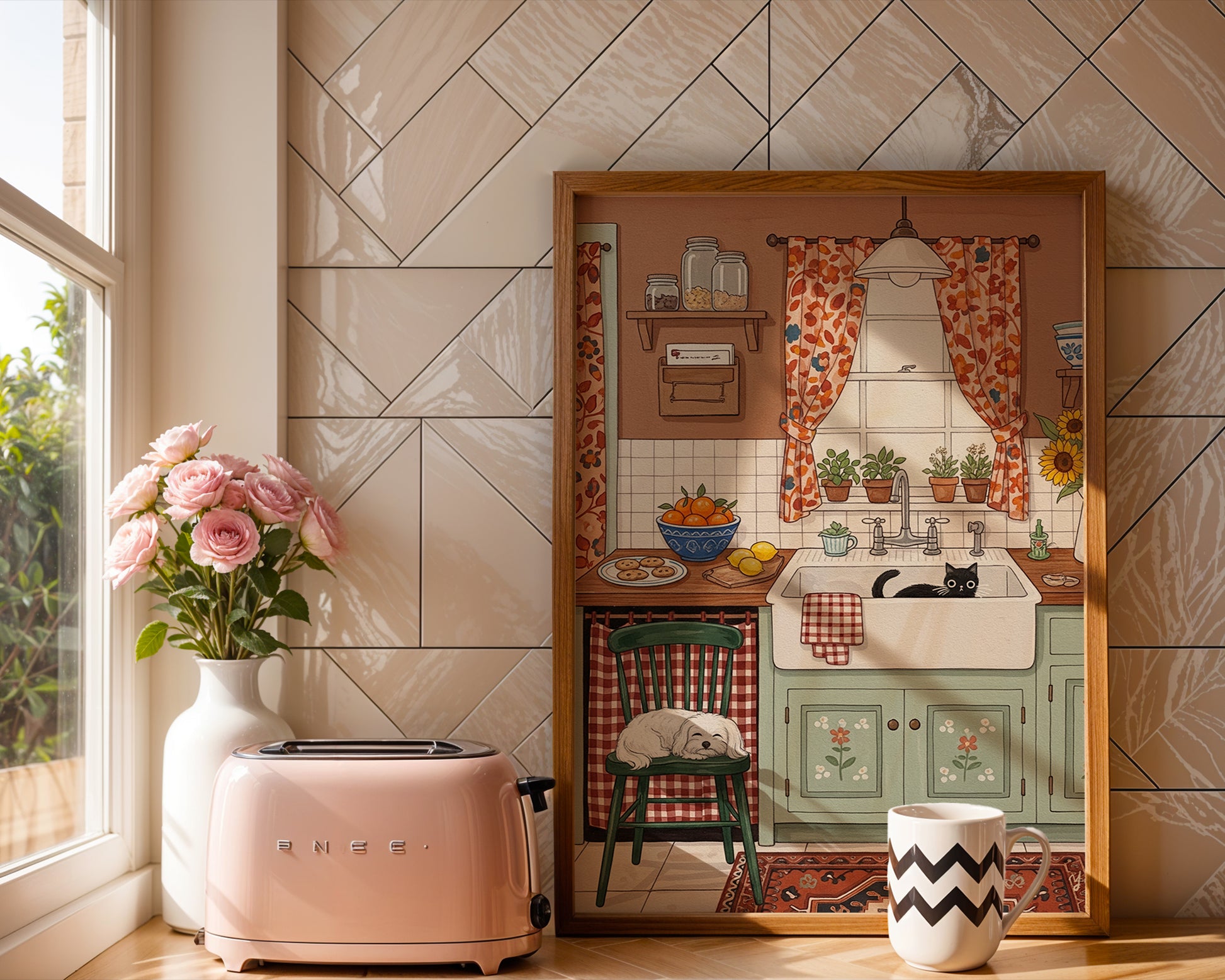 Bring the warmth of a farmhouse kitchen to your home with this charming wall art print. Featuring a fluffy white Maltese dog napping on a green chair and a cute black cat sitting in the sink, this rustic illustration captures cozy cottage vibes. Perfect for pet lovers and farmhouse kitchen decor enthusiasts, this piece showcases beautiful floral curtains, mint green cabinets, and a vintage 'FARM FRESH' sign. Ideal for rustic kitchen decor, animal art collectors, and those who adore cozy country aesthetics.