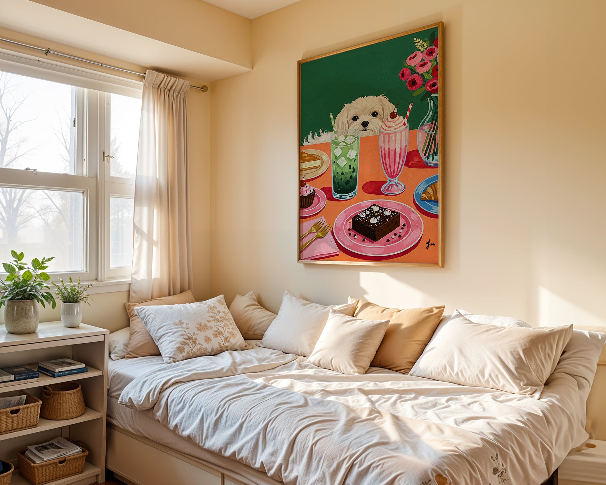 This charming illustration features a fluffy white dog peeking over a vibrant dessert table filled with sweet treats like chocolate brownies, cupcakes, cherry milkshake, iced green tea, pie, and croissant. A bouquet of pink ranunculus flowers adds a lovely touch to the scene. Set against a deep green background and orange-pink table, this playful artwork captures the joy of cozy dessert time with your furry friend. Perfect for dog lovers and dessert enthusiasts. Artwork by YunaMoona.