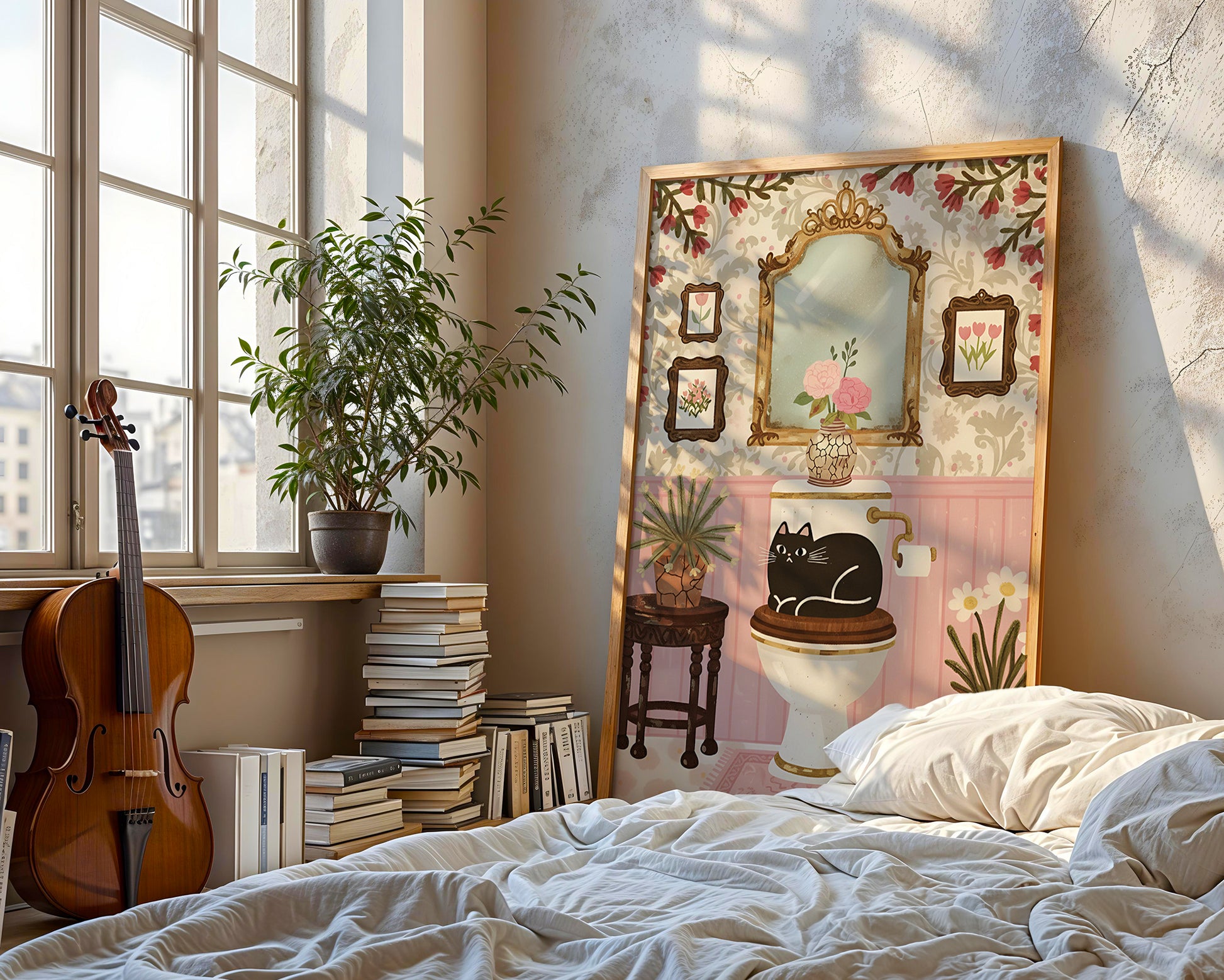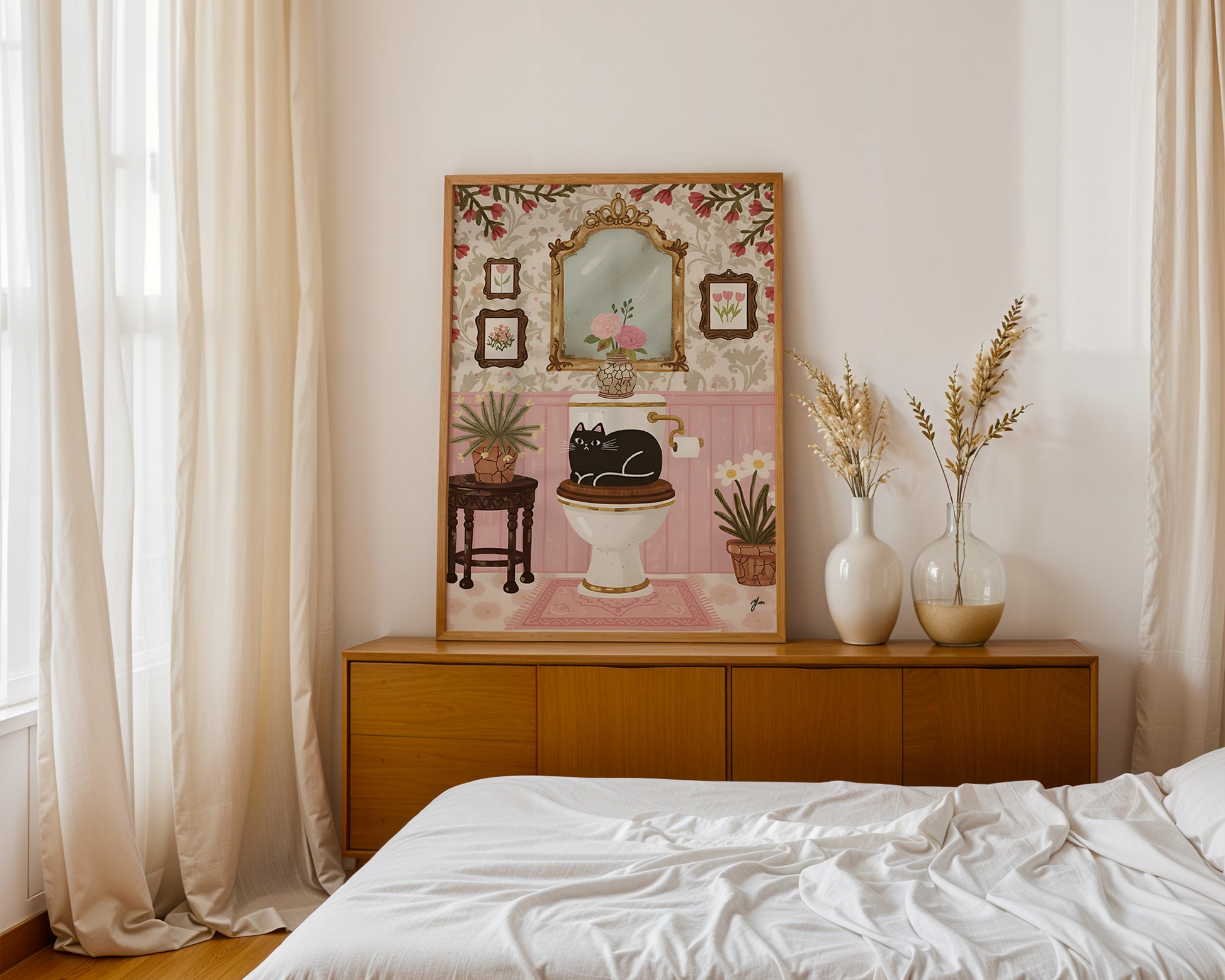 Featuring a whimsical black cat sitting on a toilet seat surrounded by floral wallpaper, framed art, and potted plants, this illustration blends cozy cottagecore aesthetics with playful humor.