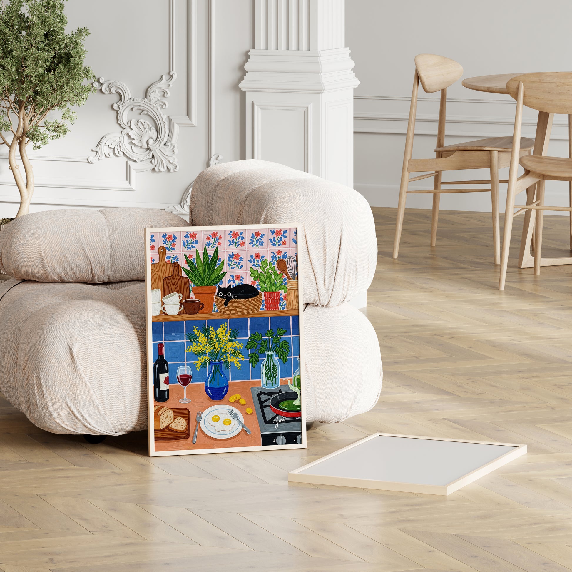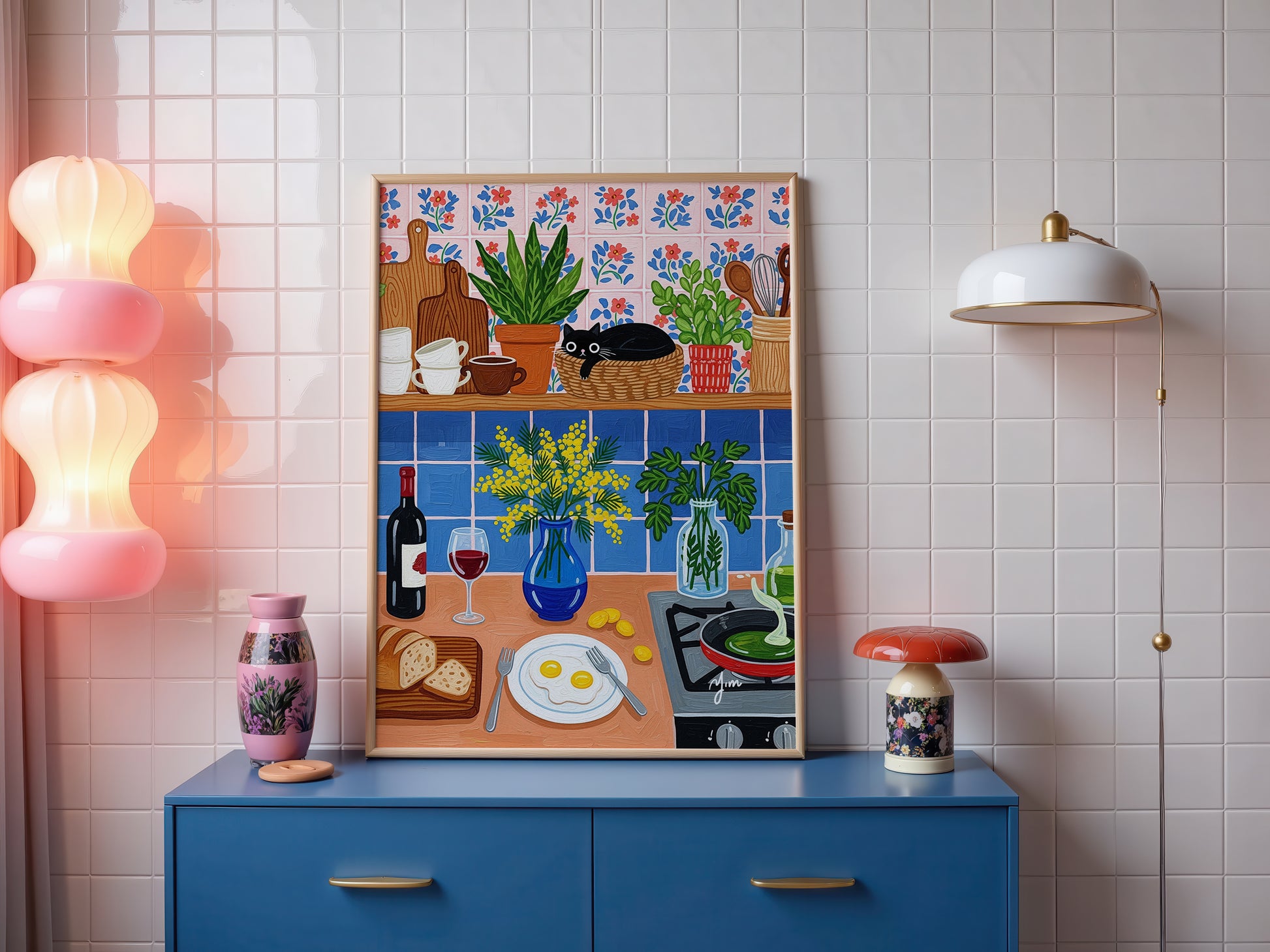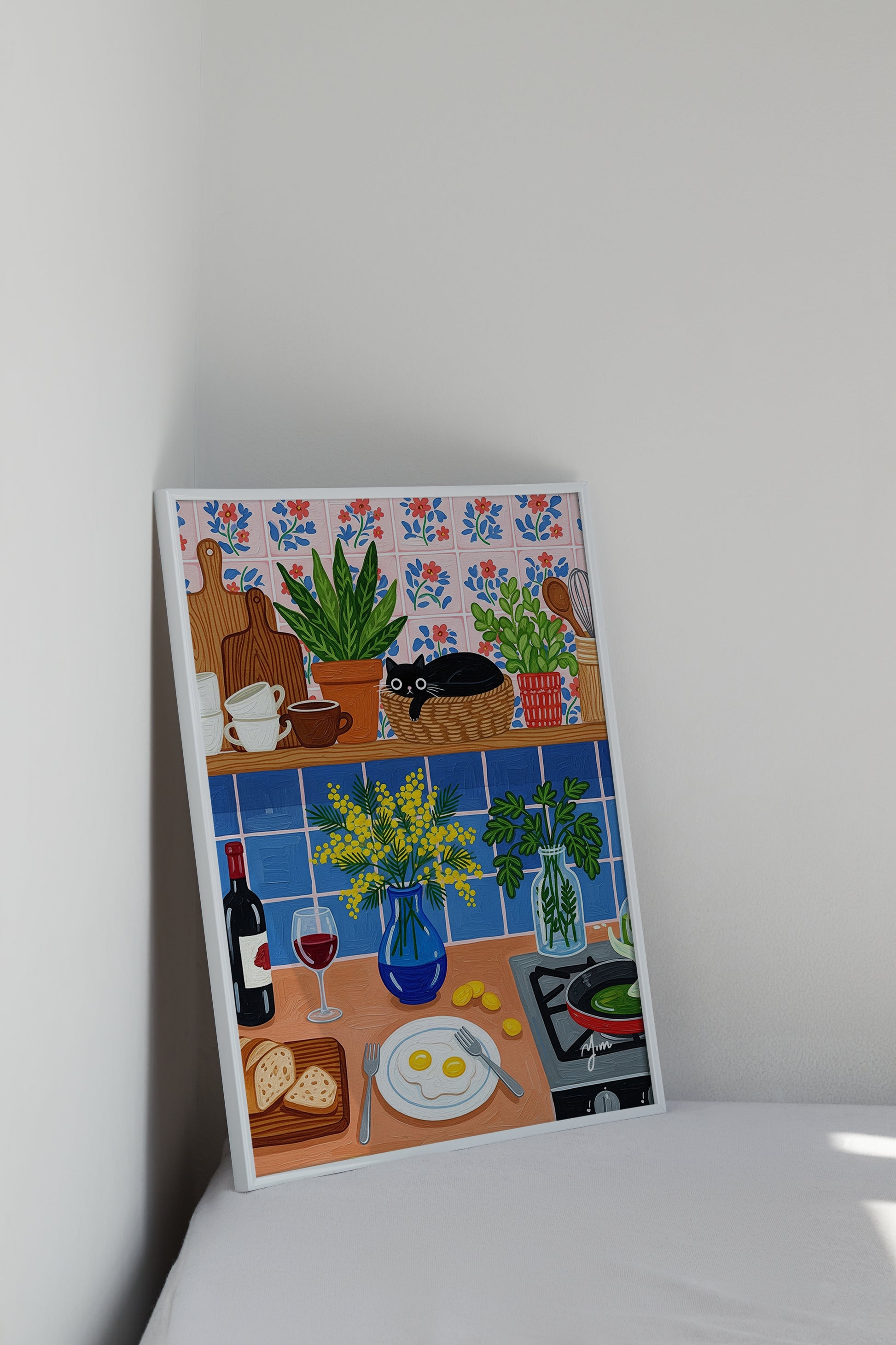 Add instant warmth to your home with this vibrant art print of a black cat lounging in a wicker basket while breakfast sizzles nearby. The Mediterranean‑inspired kitchen features hand‑painted floral tiles, sunny fried eggs, crusty artisan bread, a bouquet of yellow mimosa in a cobalt vase, fresh green herbs, and a splash of red wine. Perfect for cat lovers, foodies, and anyone seeking cottagecore or farmhouse kitchen décor, this high‑quality print is produced from original YunaMoona artwork on archival matte paper.