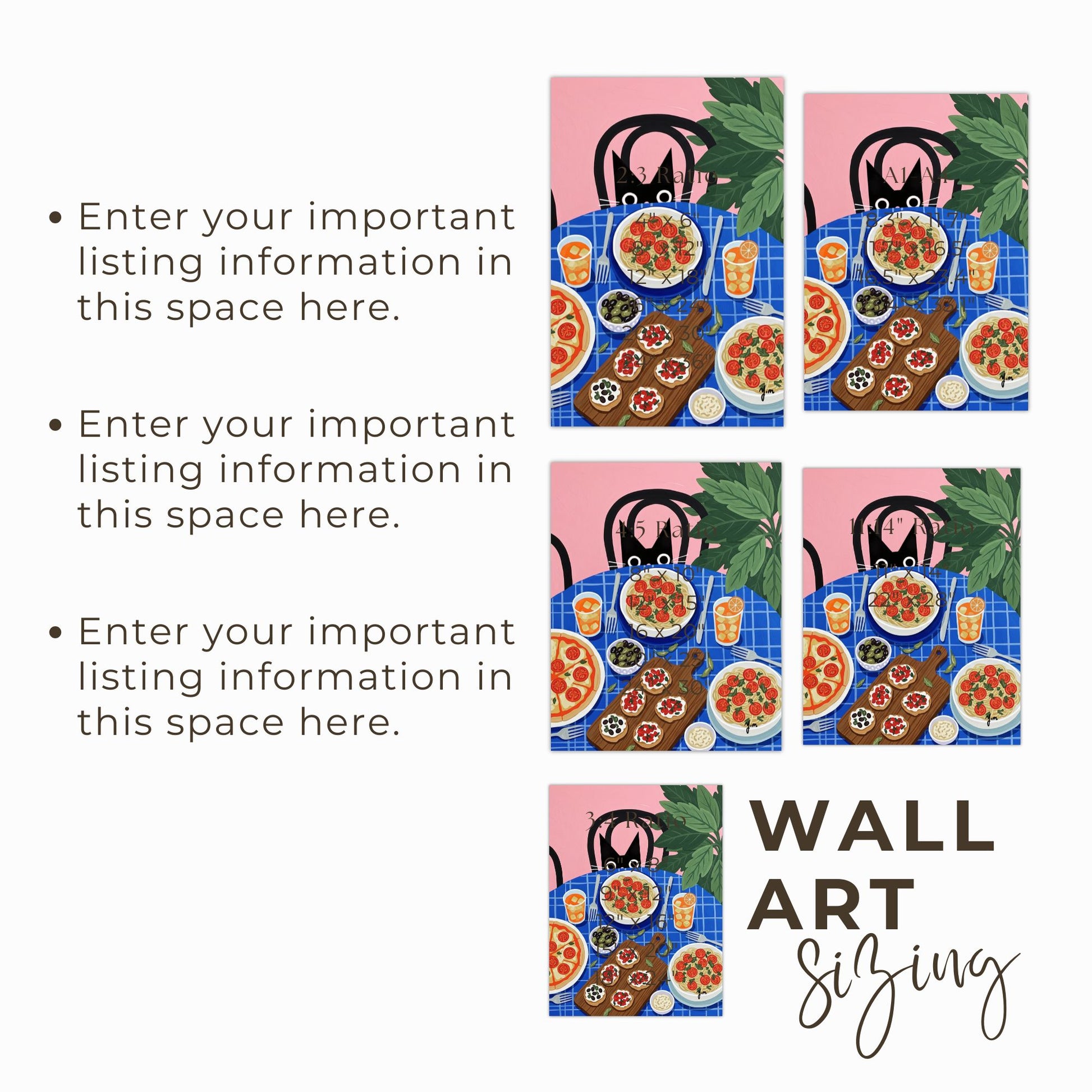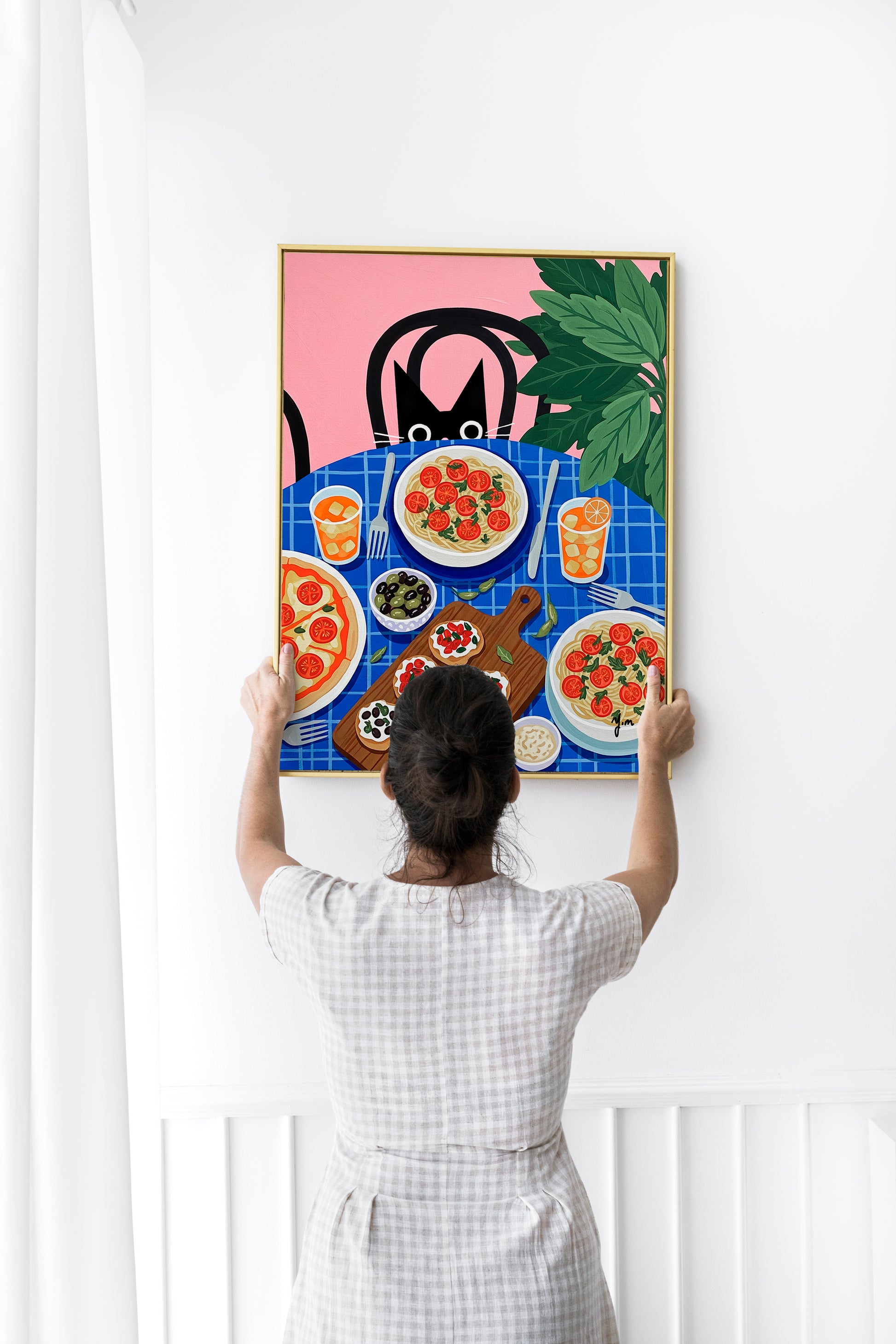 A playful illustration featuring a black cat peeking from behind a pink-backed chair at a colorful table filled with Italian food. The blue checkered table is covered with spaghetti topped with cherry tomatoes, a tomato and cheese pizza, olives, bruschetta, and iced drinks. A lush green plant decorates the scene, creating a cozy and inviting vibe. The curious black cat adds humor and charm, making this the perfect artwork for kitchens, dining rooms, or cat and food lovers.