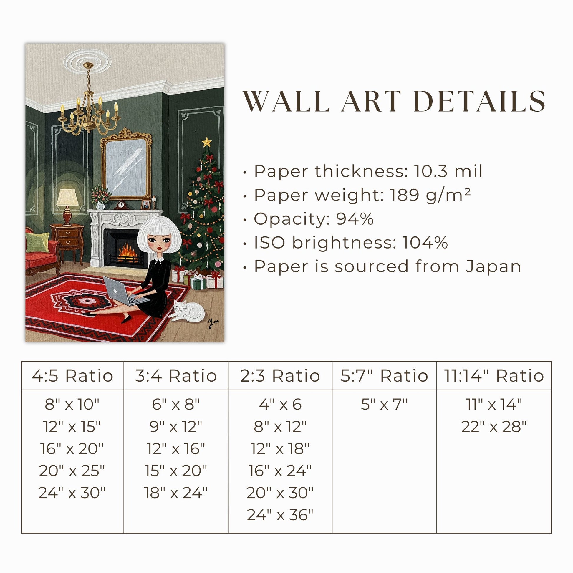 Elegant Christmas Interior Illustration with Woman Cat Fireplace and Festive Holiday Tree Art Print