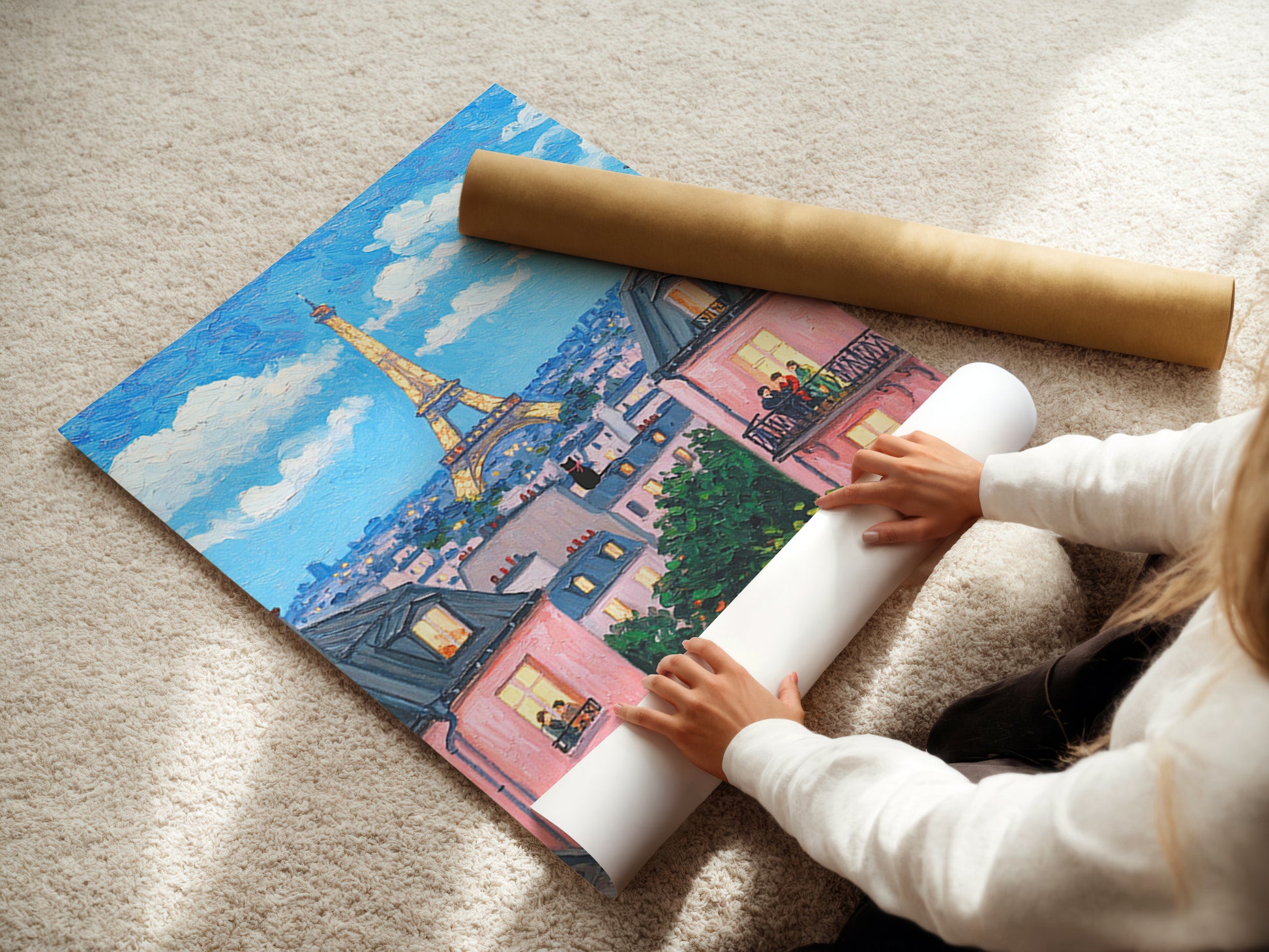 Bring the magic of Paris into your home with this romantic art print featuring the iconic Eiffel Tower glowing at dusk. Surrounded by charming pink Parisian rooftops and cozy windows filled with warm moments, this cityscape captures the timeless beauty of the City of Love. Perfect for lovers of travel, France, and dreamy balcony scenes, this print adds elegance and heart to any space.