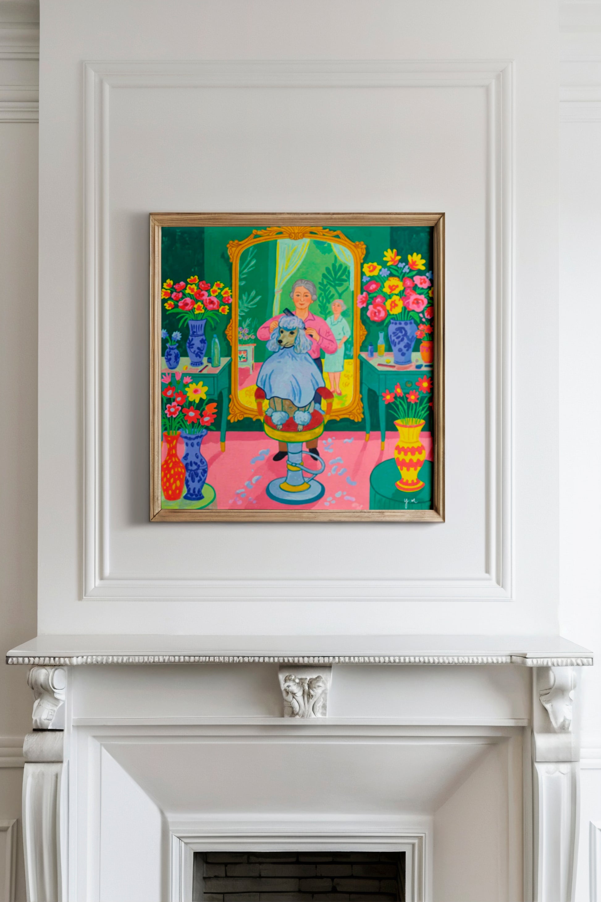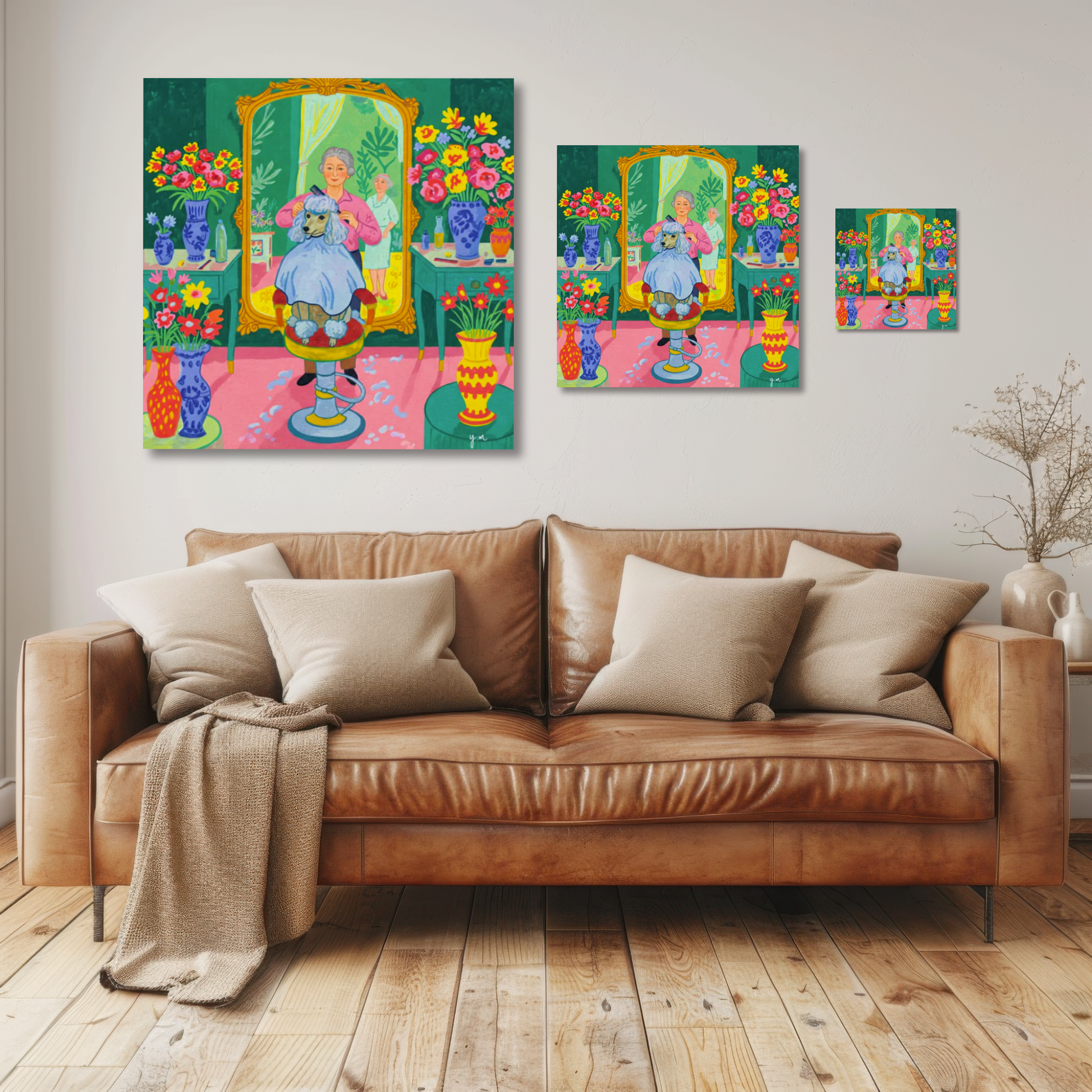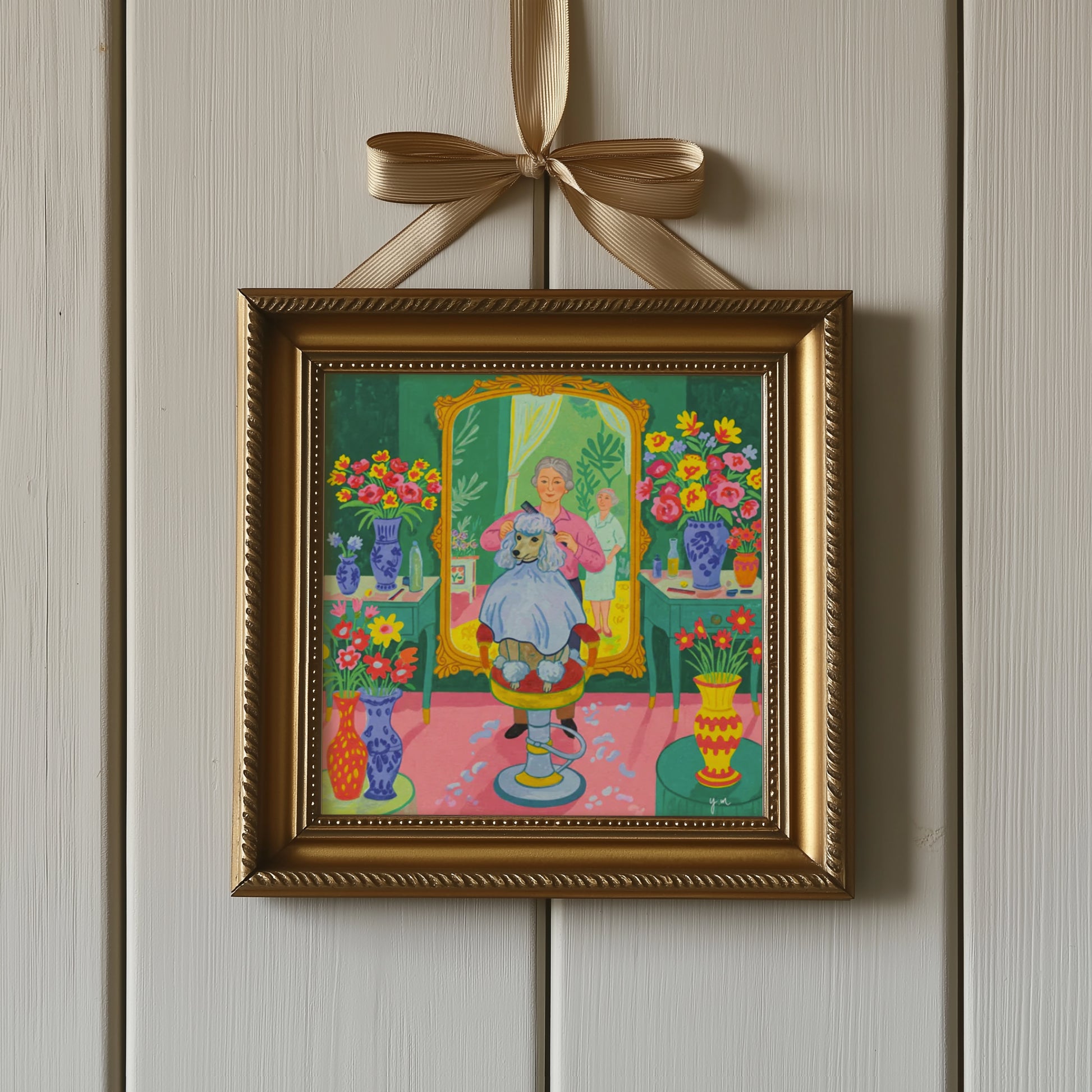 Add playful charm to your space with this delightful wall art featuring a toy poodle getting pampered at a stylish dog salon. The scene showcases a beautifully groomed poodle sitting calmly while receiving a haircut in a chic green-toned interior. Surrounded by vibrant floral vases and botanical accents, the artwork captures a whimsical, spa-like moment perfect for dog lovers and design enthusiasts. Ideal for decorating grooming salons, bathrooms, or cozy corners at home. Printed on high-quality paper with vivid colors and elegant detail, this piece brings joy and elegance together.