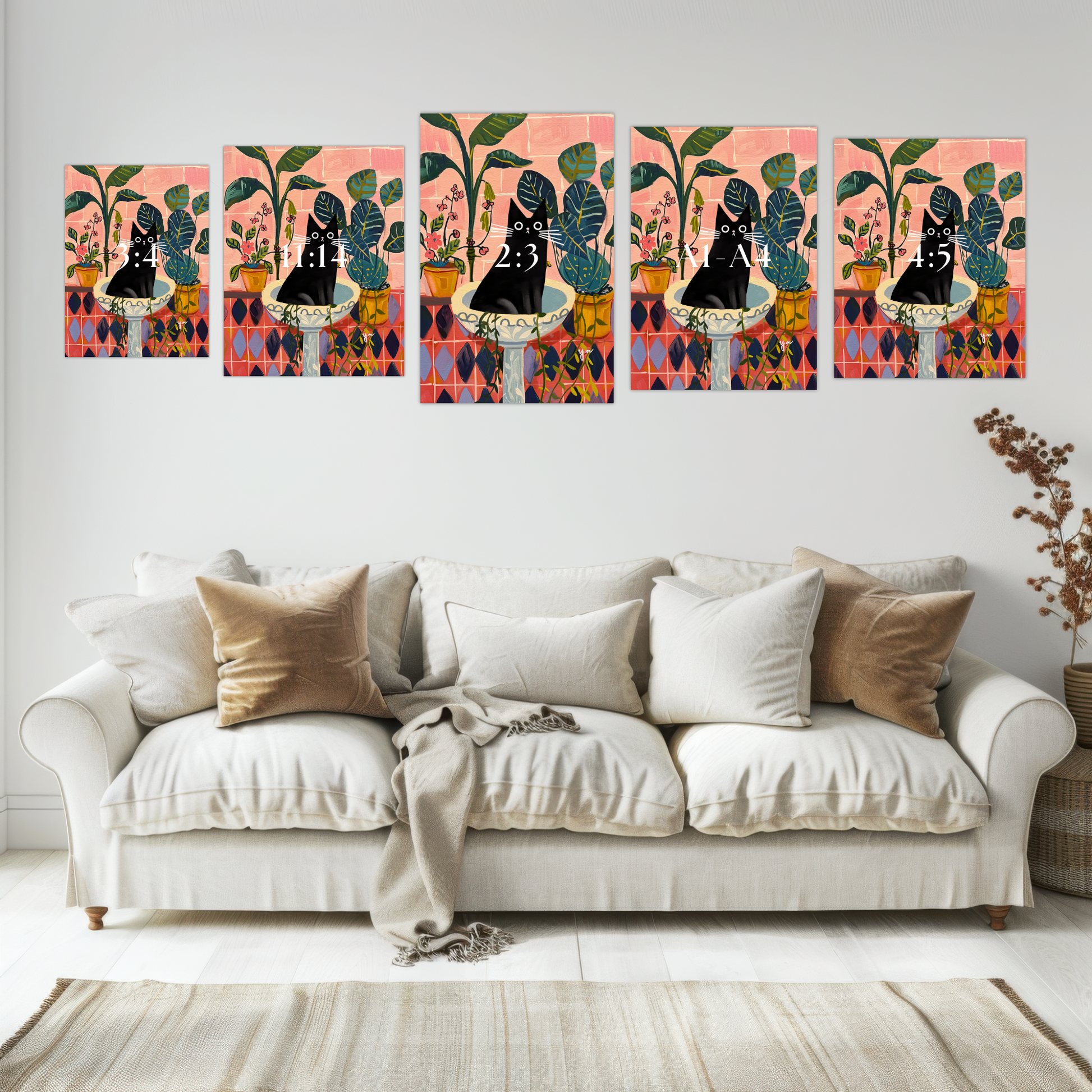 🌿 Meet your new favorite wall art – a charming black cat sitting proudly in a vintage birdbath, surrounded by vibrant tropical houseplants 🌱 This whimsical illustration is full of playful energy, bold colors, and personality. Set against a pink tiled wall, the scene is perfect for plant lovers, cat enthusiasts, or anyone who appreciates quirky, bold art.