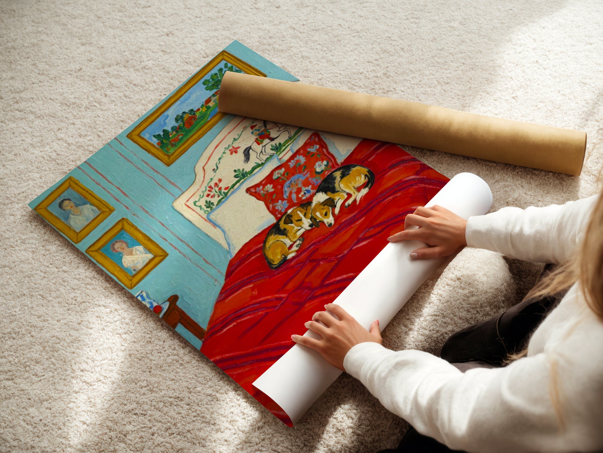 Add warmth and charm to your space with this cozy art print featuring two adorable corgis peacefully sleeping on a red bed. Surrounded by vintage wall art, floral patterns, and a soft blue background, this whimsical scene by YunaMoona brings a sense of comfort and storytelling into any room.