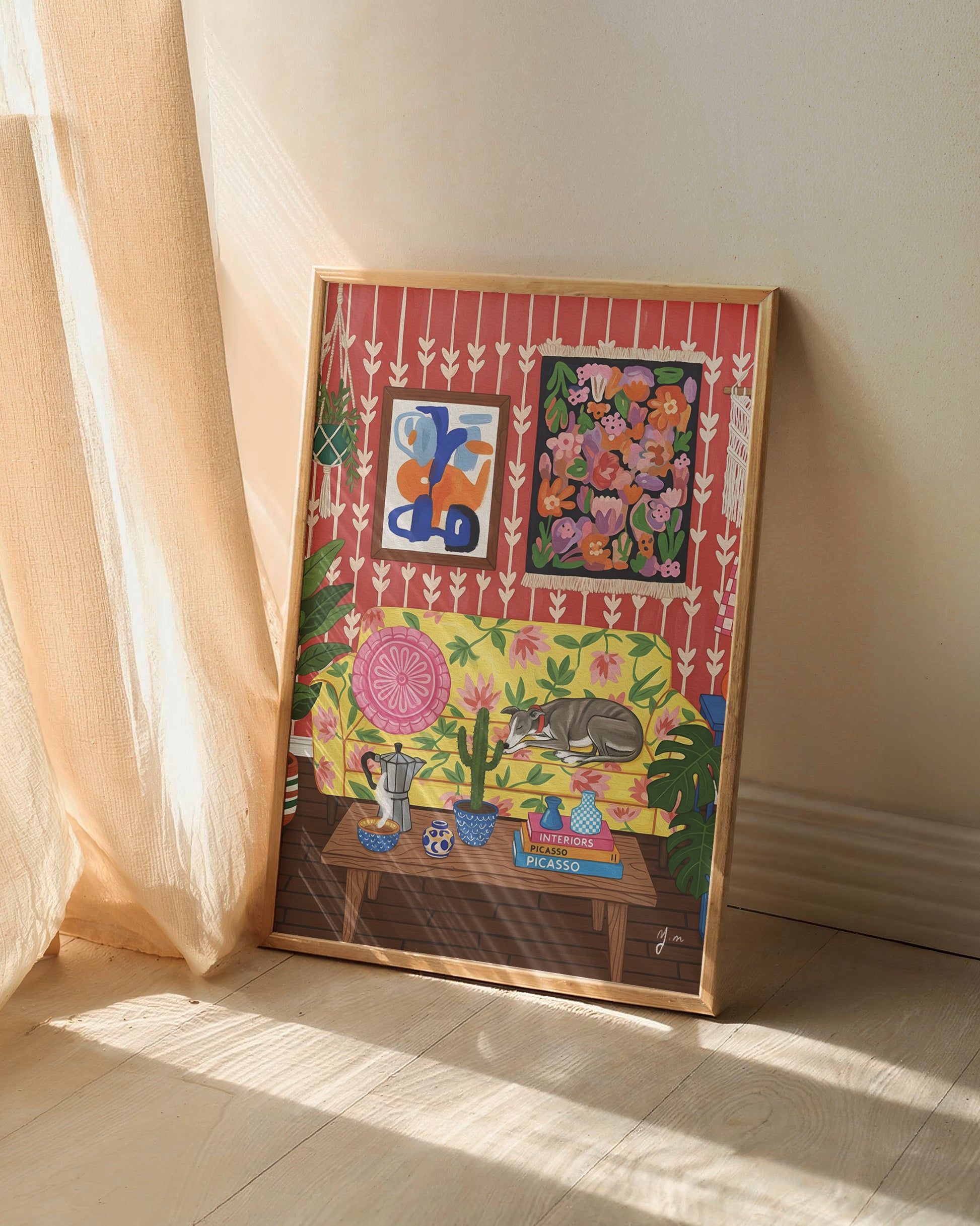Bring bold color and laid-back charm into your space with this vibrant art print by YunaMoona. A graceful greyhound naps on a yellow floral couch while abstract art, a flower tapestry, woven macramé, trailing plants, and stacked art books fill the bohemian living room with personality. Perfect for dog lovers, eclectic décor fans, and anyone who adores maximalist interiors.