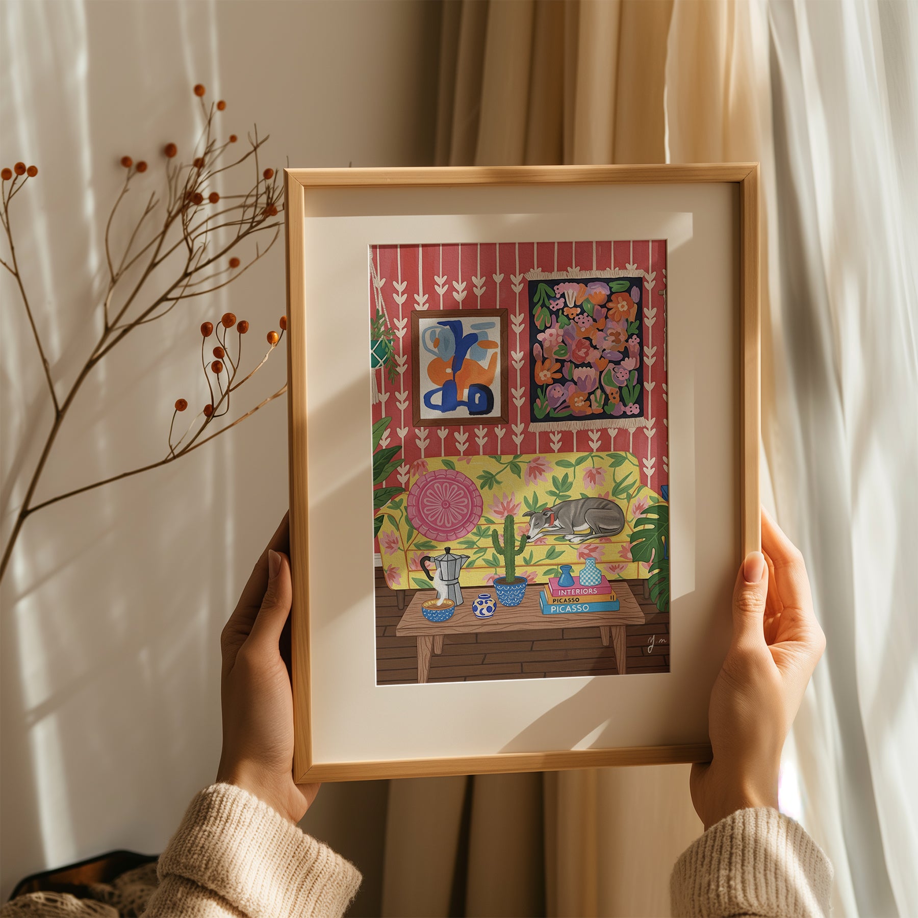 Whimsical Greyhound Living Room Art Print Dog Sleeping on Floral Sofa Boho Interior Illustration Poster
