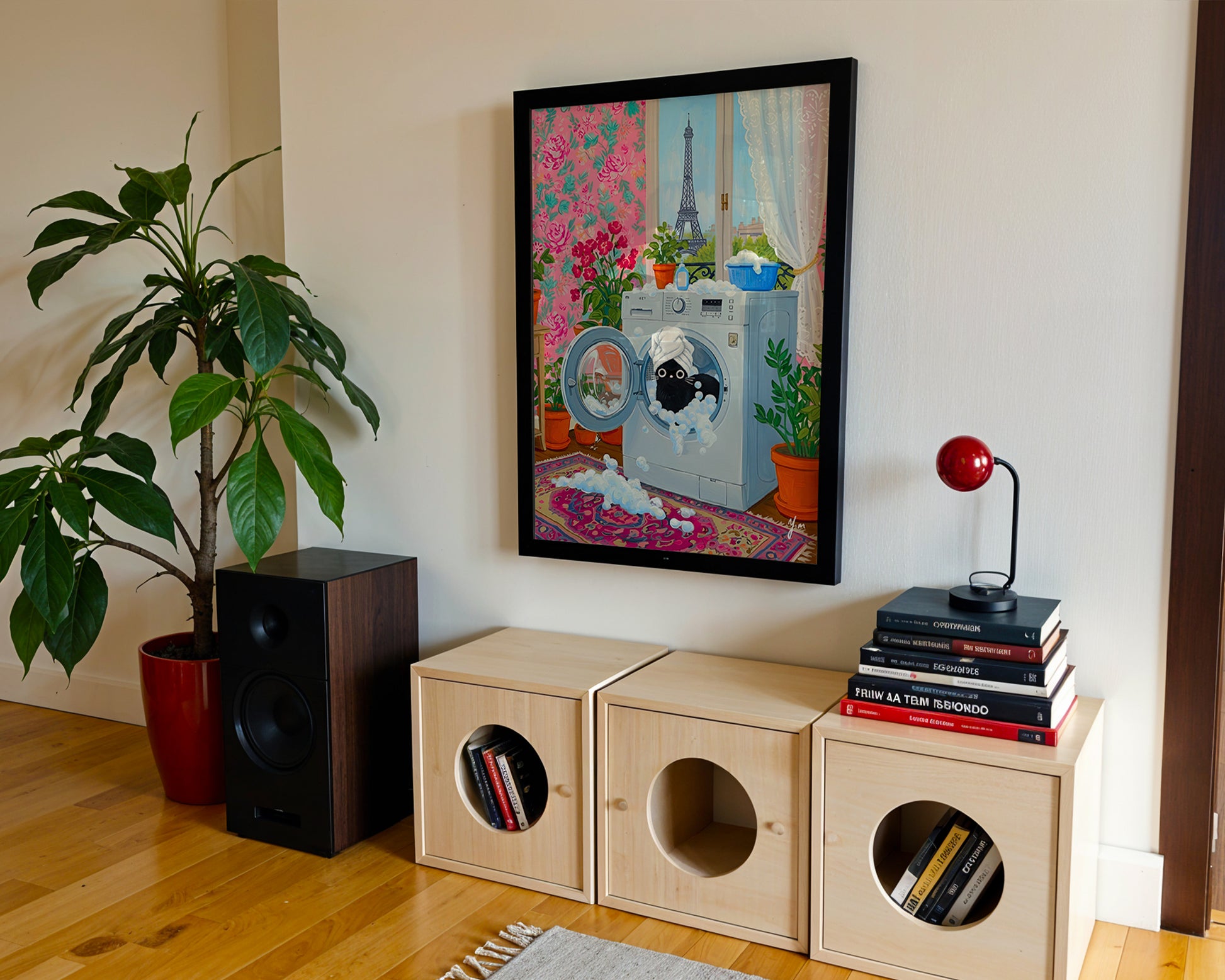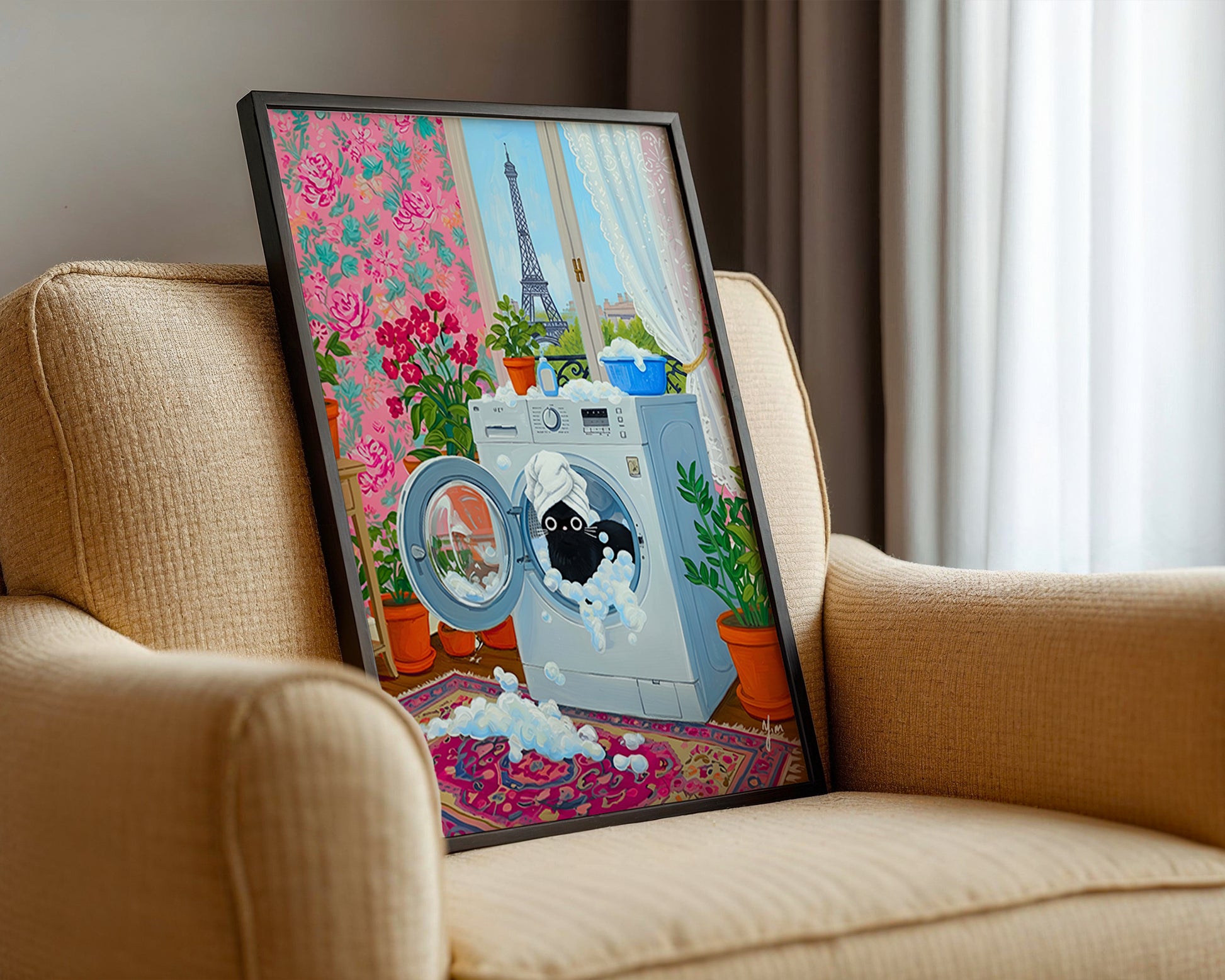 A stylish black cat relaxes inside a washing machine filled with fluffy bubbles, surrounded by lush plants, floral wallpaper, and a dreamy view of the Eiffel Tower. This charming scene brings humor, warmth, and vibrant color to any room.